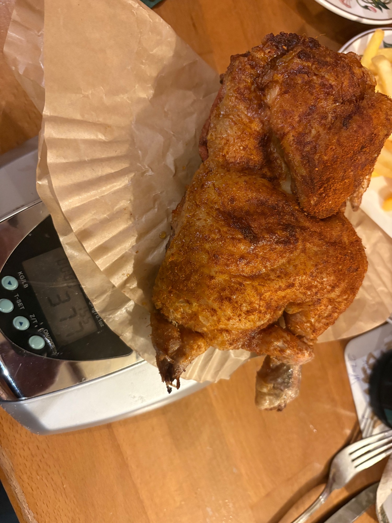 Leider ist der Gockel mit 377g sehr klein. Unter 400g ist ein halber Hahn generell doch schon sehr überschaubar. Damit wird ein guter Esser in der Regel ohne Beilagen nicht satt.