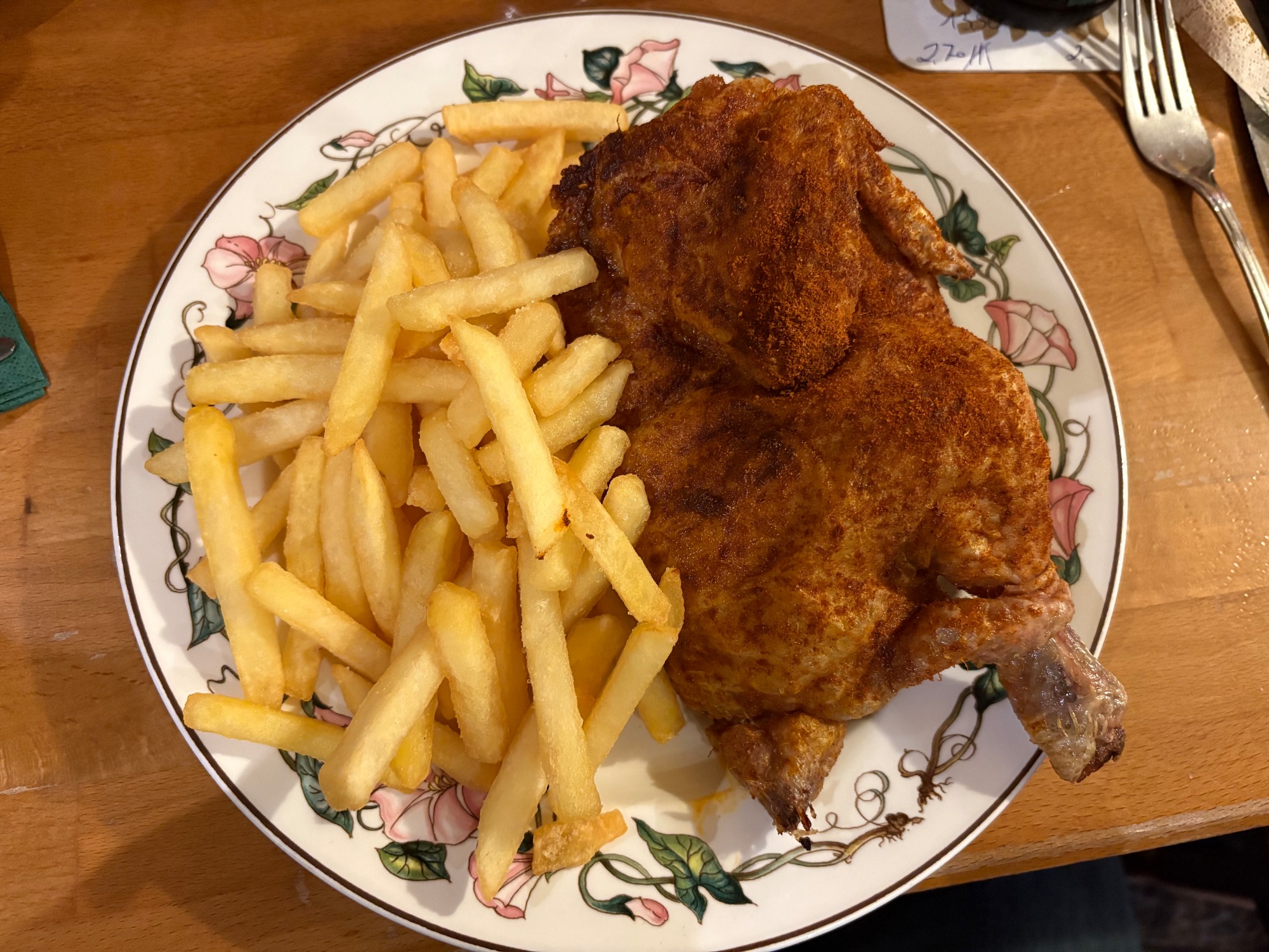 Halbes Hähnchen mit Pommes und Salat kostet 13,50€; auch sehr günstig.